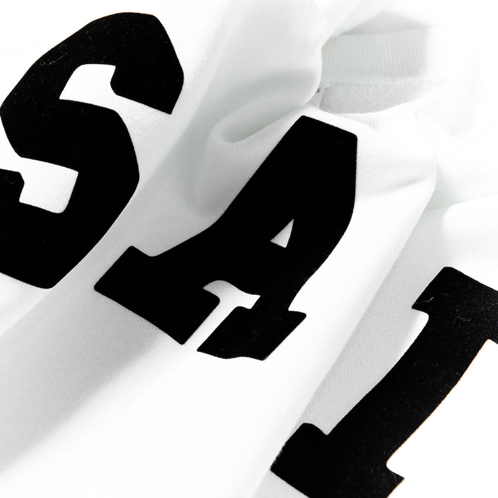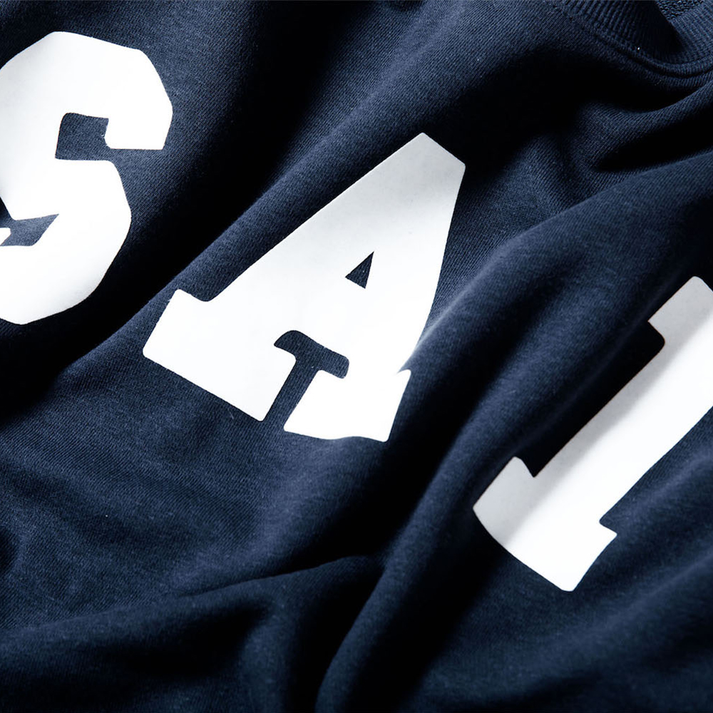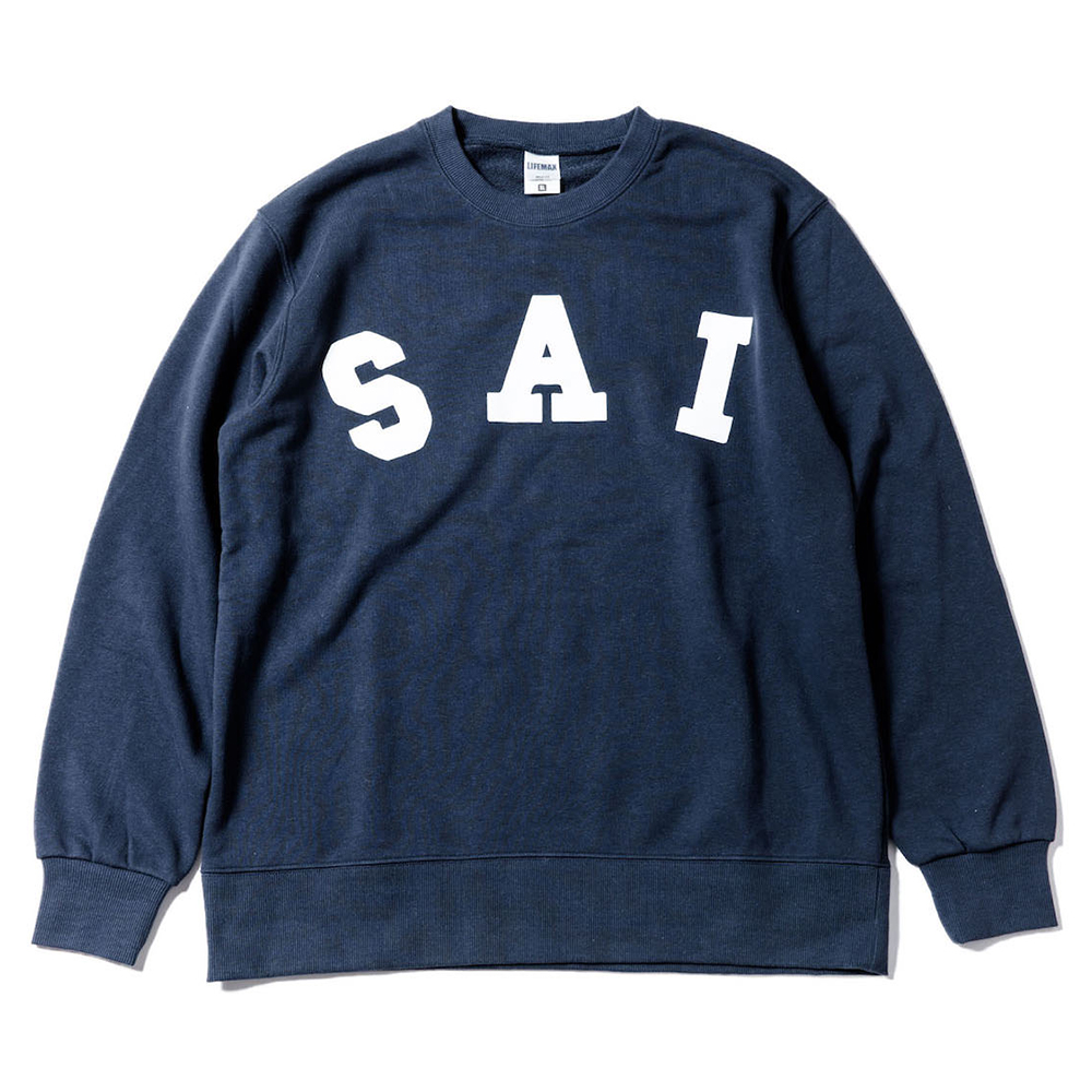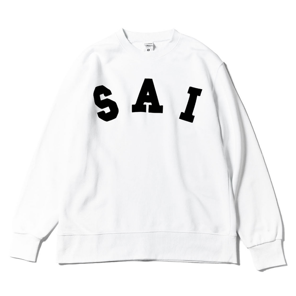 “SAI”をカレッジテイストにアレンジし、並びにも変化を加え、フロッキープリントにて製作されたスウェット。
