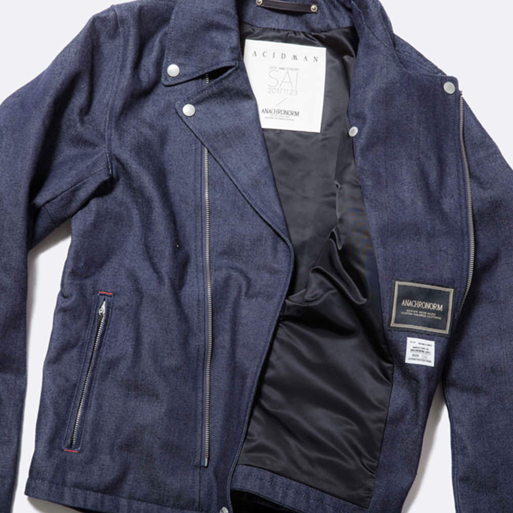 型番は、大木伸夫が愛用しているダブルライダースの型を採用。アナクロノームが定番的に使用している13.5ozのセルビッチデニム、裏地に厚手のナイロンサテンを使用することでレザーの厚みを出している。ユーザーが着込むことでエイジング感を出せるように、あえてリジットで仕上げている。ネームは今回用にデザインされたオリジナルネーム、大木の手書きのシリアルナンバーが入る予定。ACIDMAN 20周年を記念し、20着限定販売。