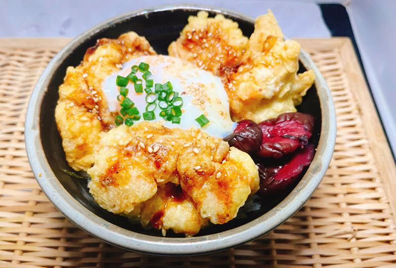 出汁に漬け込んだ風味豊かな鶏肉を天ぷらの衣で包みました。