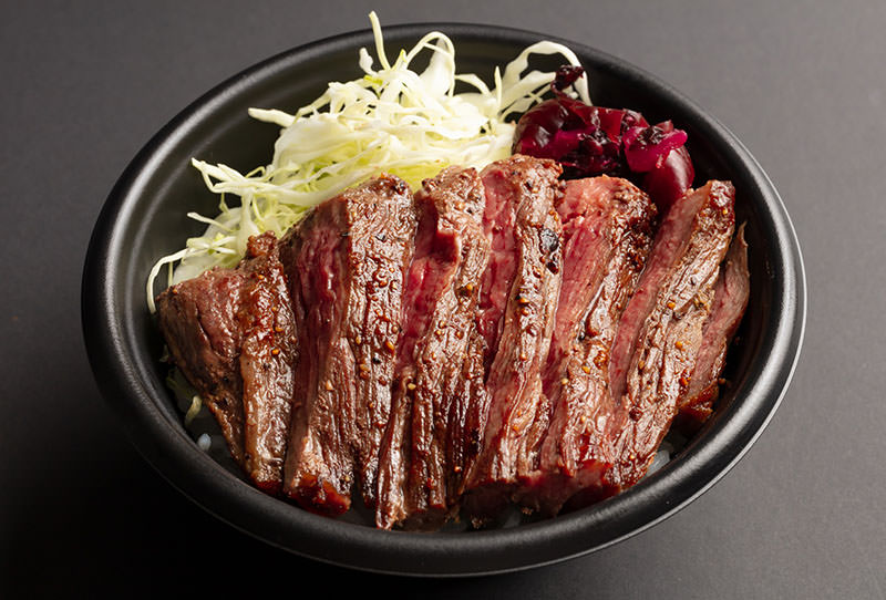⾁はアツイ内に⾷うべし! ブラックアンガス⽜を使⽤した名物ビフテキ丼は記憶にも胃袋にも残る逸品です。 ⽶国産⿊⽑⽜の『味⼒』をどうぞ!